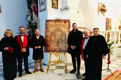 El párroco y el alcalde de Fondón junto al cuarteto Anacrusa y el boceto del retablo.